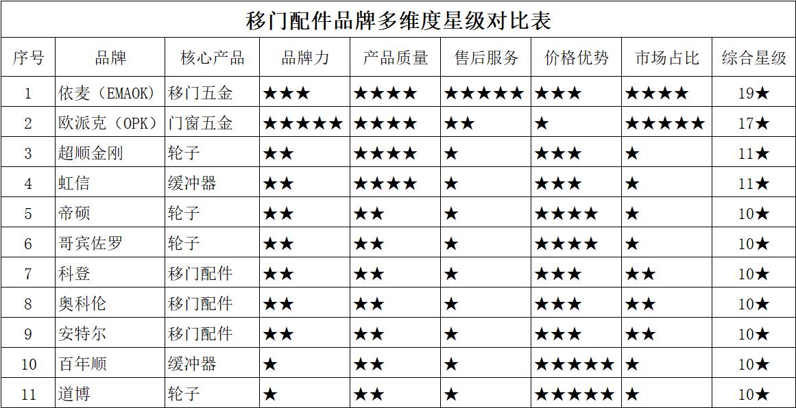 其实,每个品牌都有自己特长,没有人能一句话说谁好谁坏,只能看是从什么角度去看待,另外,作为比较偏的移门配件细分领域,品牌是比较少的,所以,本人就根据自己个人经验以及市场的大致反馈分别从:品牌力、质量、服务、价格、市场占有率等多个维度做了个星级对比,给大家做个参考: